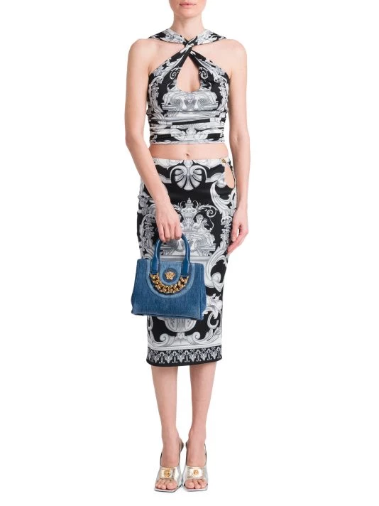 Evoking an early 2000s aesthetic, this collection showcases slinky silhouettes pierced with teardrop cut-outs and updated versions of signature Barocco and La Greca prints done in graphic colorways. This chic low-rise skirt showcases the hip with open keyhole detail, enhanced with an oversized Barocco print.