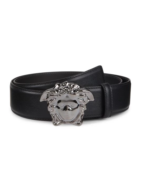 Leather belt with Medusa head buckle.