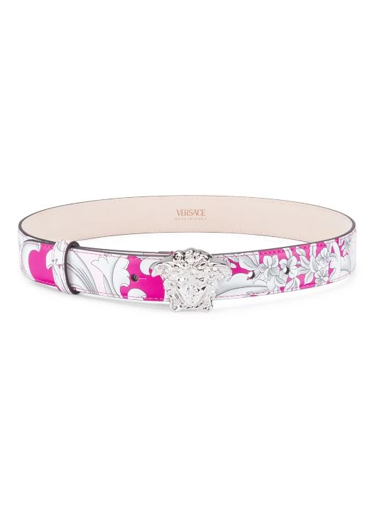 Versace’s leather belt is printed with a signature pattern and topped with a Medusa head logo buckle.