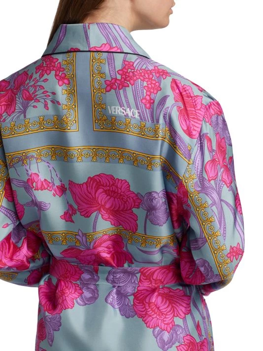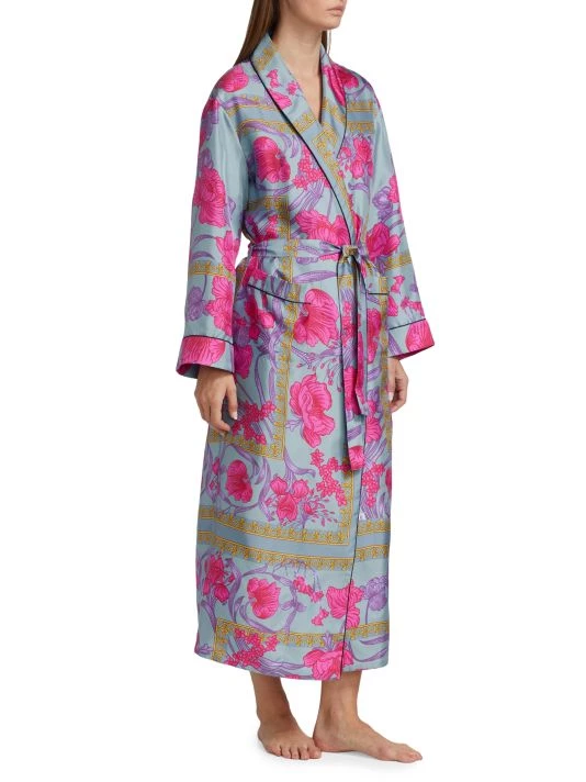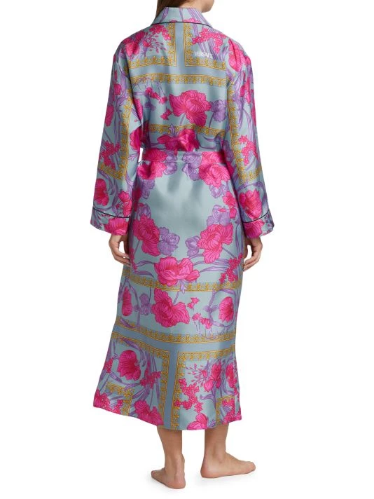 Crafted of pure silk twill, this Versace robe features a bright floral print. Side patch pockets and classic contrast piping finish this luxe style.