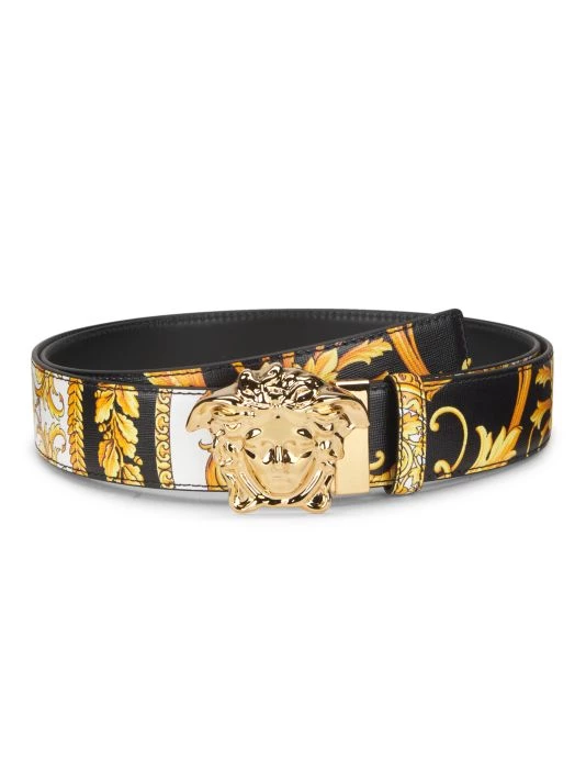 Reverses from Barocco print to solid, this leather belt is highlighted with polished Medusa head buckle.
