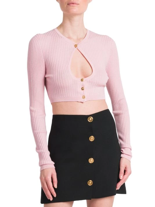 Evoking an early 2000s aesthetic, this collection showcases slinky silhouettes pierced with teardrop cut-outs and updated versions of signature Barocco and La Greca prints done in graphic colorways. This cropped cardigan highlights the bodice with keyhole detail, finished in a sporty rib-knit.