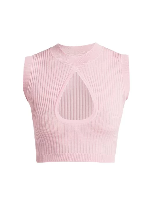 Evoking an early 2000s aesthetic, this collection showcases slinky silhouettes pierced with teardrop cut-outs and updated versions of signature Barocco and La Greca prints done in graphic colorways. Crafted of luxurious Italian wool, this rib-knit top boasts an eye-catching keyhole at the bodice.