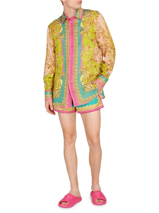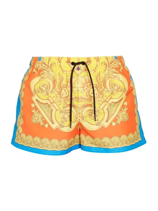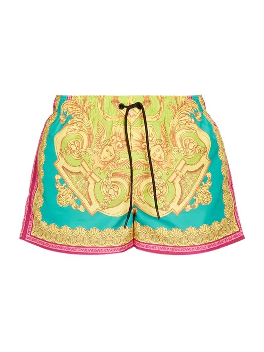 For this season, Donatella Versace blended the house’s quintessentially Italian luxe tailoring with a Gen Z edge. The Artistic Director’s use of the label’s Medusa logo, La Greca print, and signature oversized safety pins were updated with a bold color palette and playful silhouettes. Finished with an elasticized drawstring waist, these swim shorts showcase a bold Rococo print with a subtle logo trim.