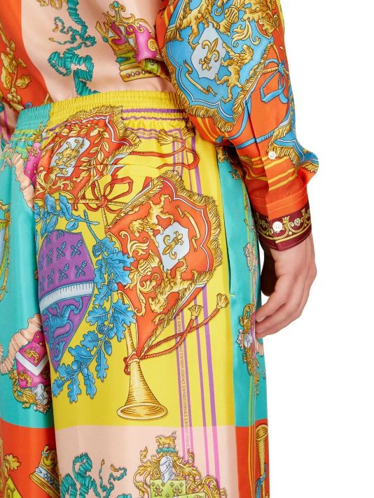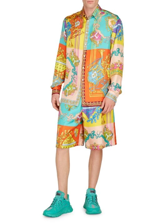 For this season, Donatella Versace blended the house’s quintessentially Italian luxe tailoring with a Gen Z edge. The Artistic Director’s use of the label’s Medusa logo, La Greca print, and signature oversized safety pins were updated with a bold color palette and playful silhouettes. Crafted of smooth silk, these basketball-style shorts are printed with vibrant, color-blocked Royalty print.
