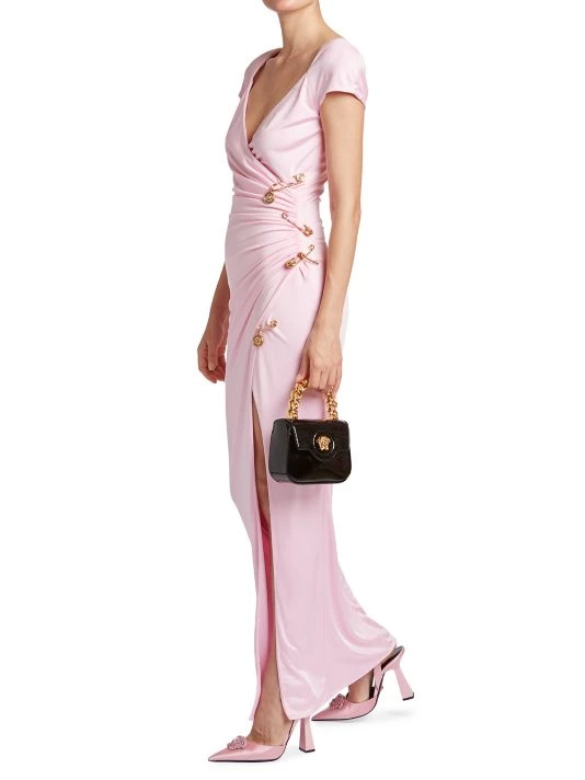 Soft jersey gown gathers across the figure adorned with edgy safety pin details, cut with a wide V-neckline and cap sleeves for an elegant touch.