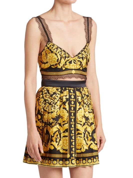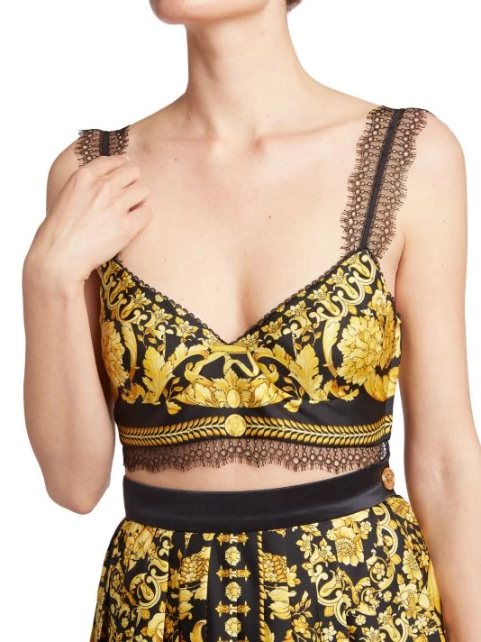 Charming bra top trimmed with eyelash lace features wide shoulder straps and oppulent heritage print.