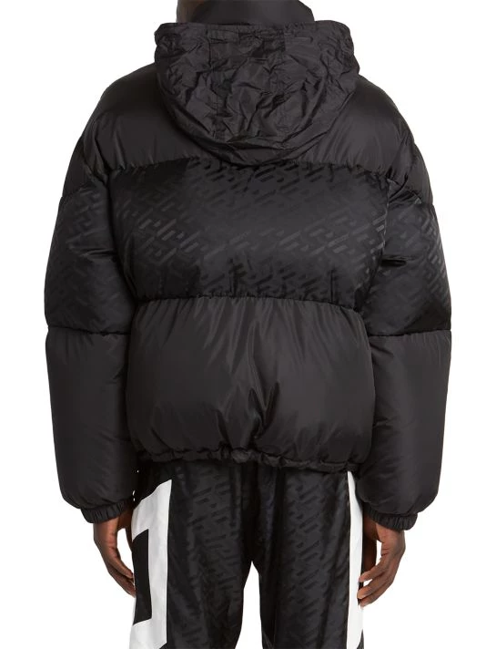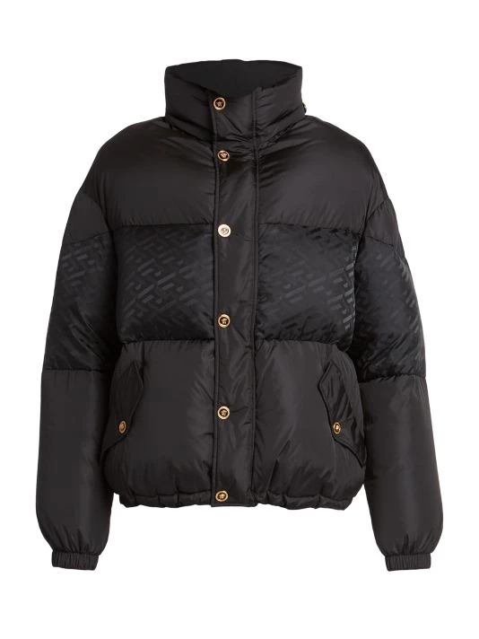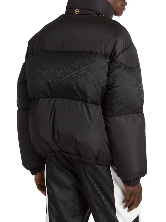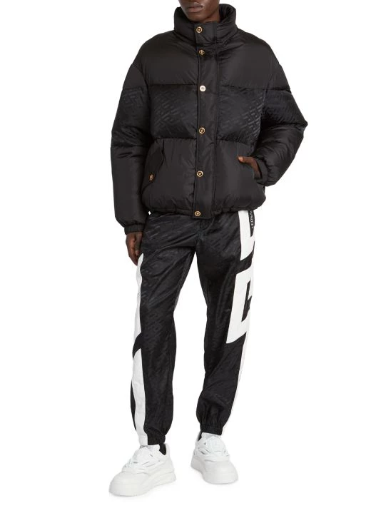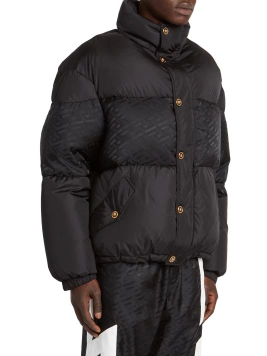 From the Silver Baroque, Silver, and Bluette Collection. This Versace puffer jacket is crafted of printed jacquard adorned with the label’s signature La Greca motif. The buttons of the closures are adorned with the Medusa-head motif.
