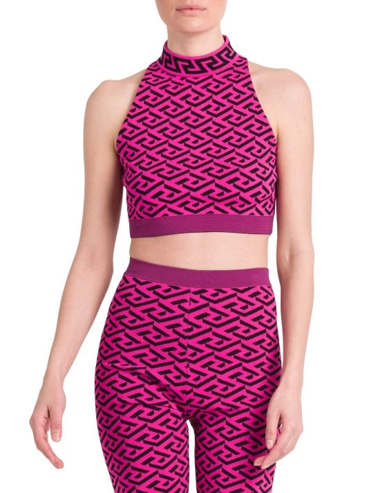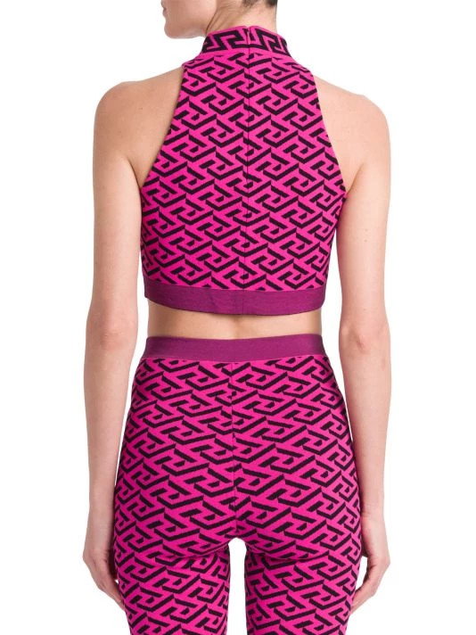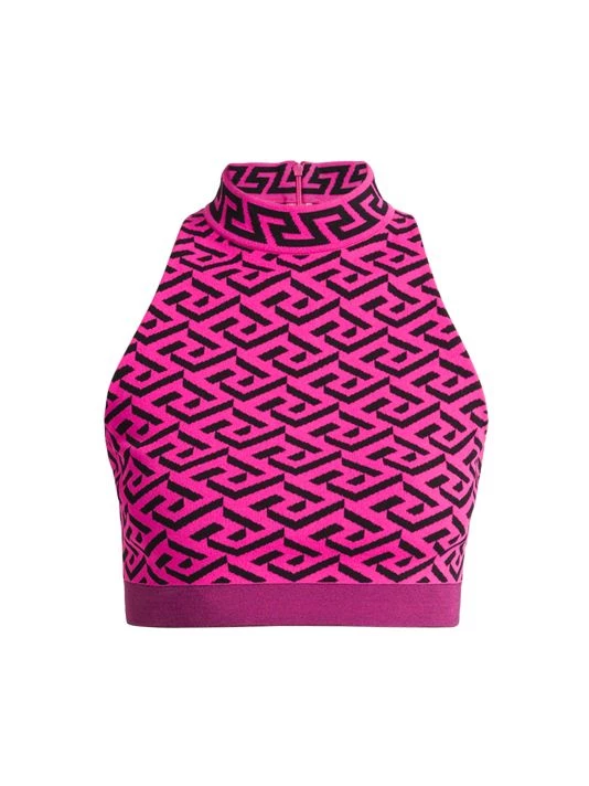 Evoking an early 2000s aesthetic, this collection showcases slinky silhouettes pierced with teardrop cut-outs and updated versions of signature Barocco and La Greca prints done in graphic colorways. This sporty knit top boasts a mockneck and sleeveless design, adorned with the La Greca pattern.