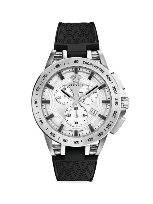 Showcasing a round stainless steel case and silicone strap, this sporty timepiece boasts a chronograph dial and date display at 4 o’clock.