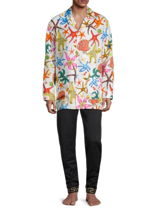 Colorful aquatic creatures adorn this pajama shirt in an allover manner.