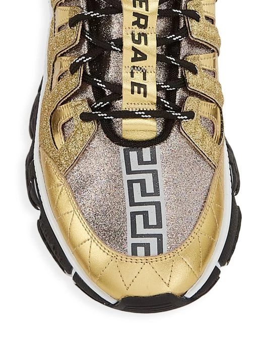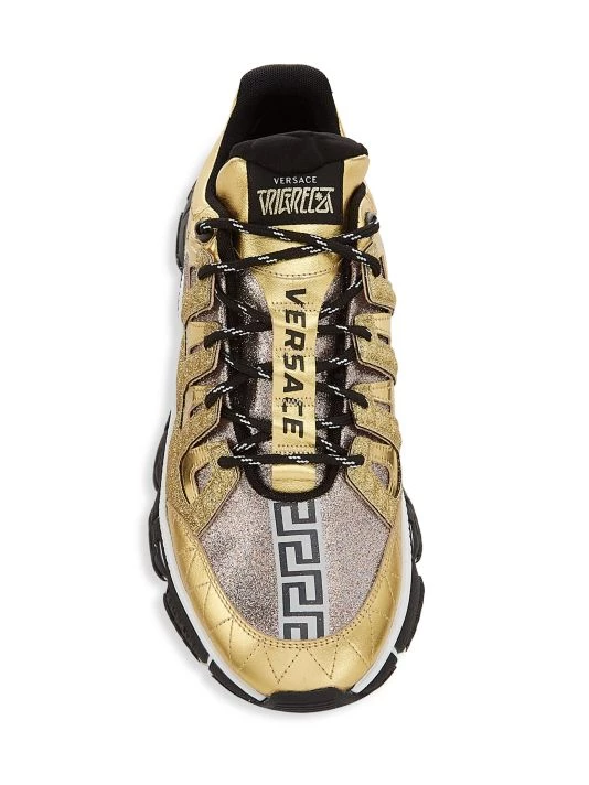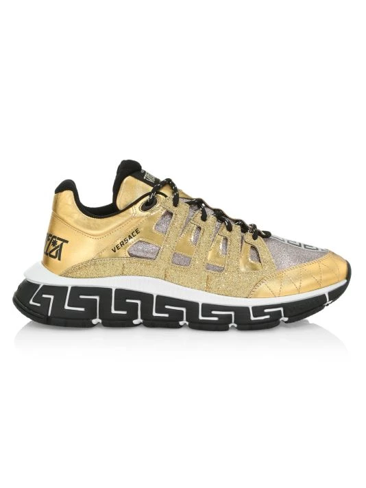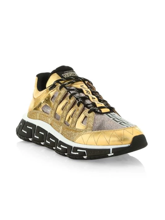 A Greek key sole defines this pair of metallic low-top sneakers.
