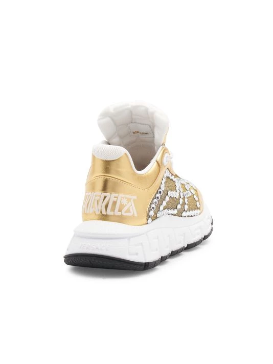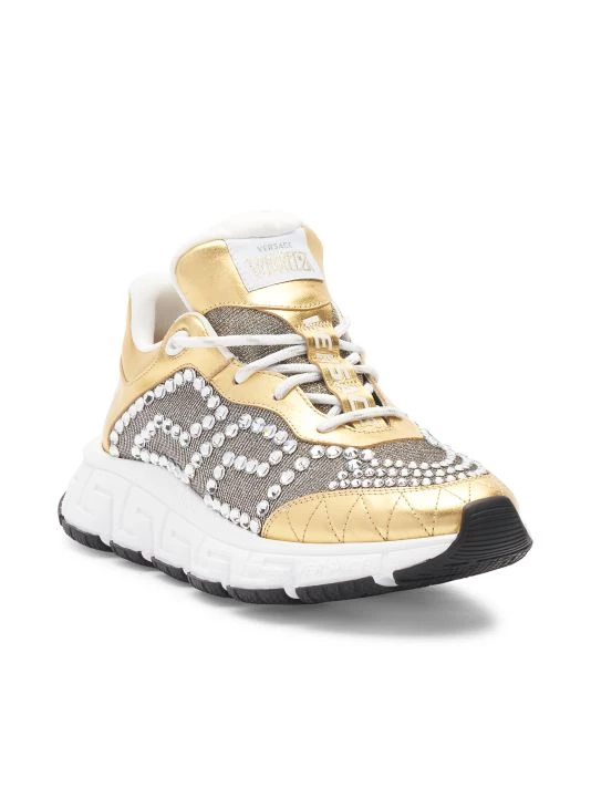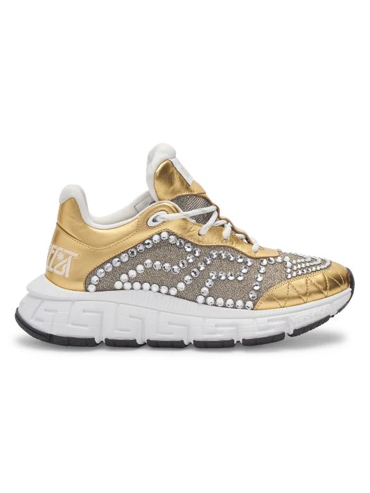 Mounted on a distinctive chunky sole, these low-top sneakers are decorated with shimmering studs boasting Versace’s iconic Greca print.