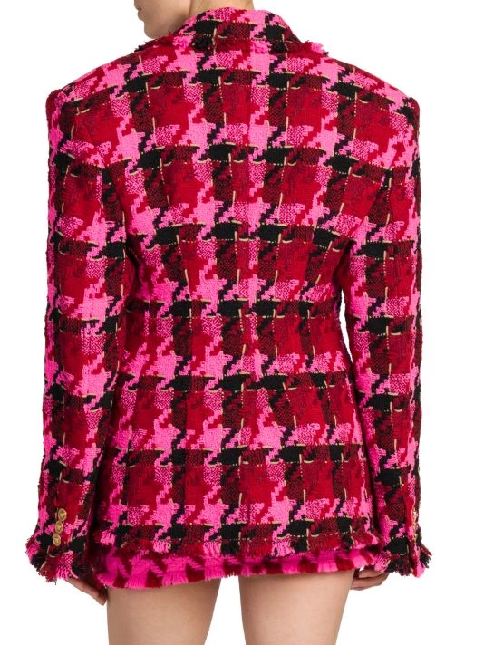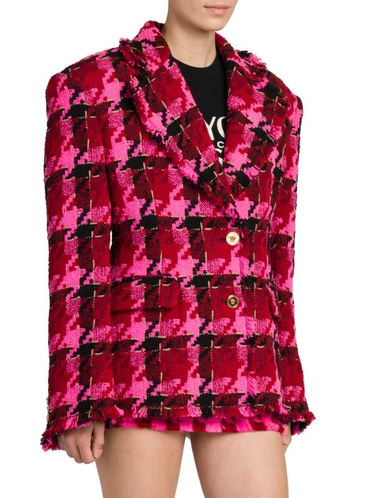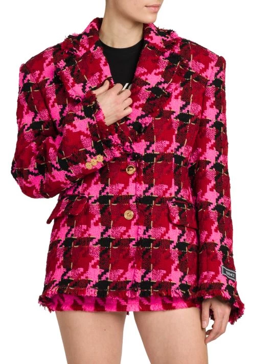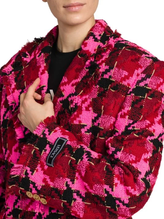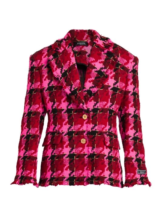 Crafted of tweed, this single-breasted Versace jacket is finished with a fringed hem.