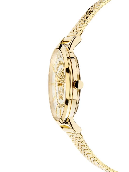 From the V-Essential Collection. The most playful and youthful collection ever, V-Essential stands out for its fashionable twist combined with a sophisticated use of the brand’s iconic codes. A watch with a contemporary essence and strong fashion soul features the use of the Medusa head engraved on the dial and metal loop on the strap. Around the indexes we find a single Greek key to reinforce the brand presence and at 12h the Versace logo stands out in a curvature.