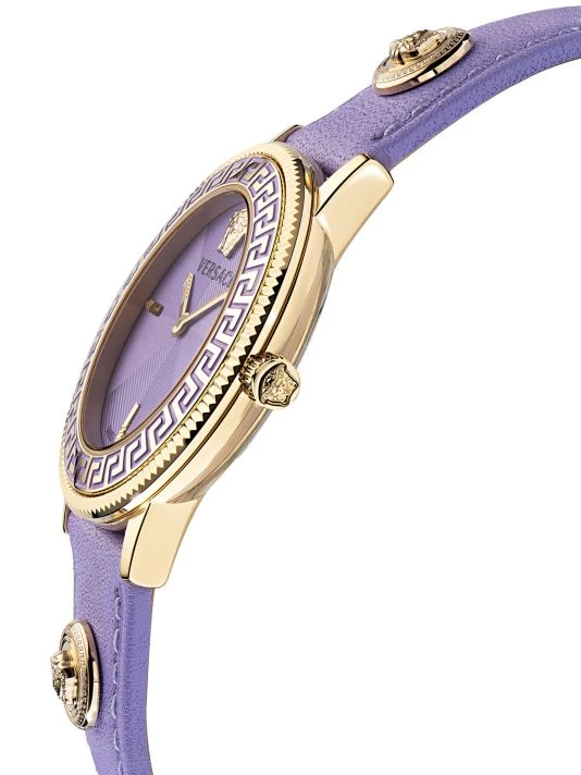 Boasting a simple four-index dial, this distinctive leather strap watch is adorned with luxe Medusa studs and is styled with Versace’s iconic Greca pattern engraved around the top ring.