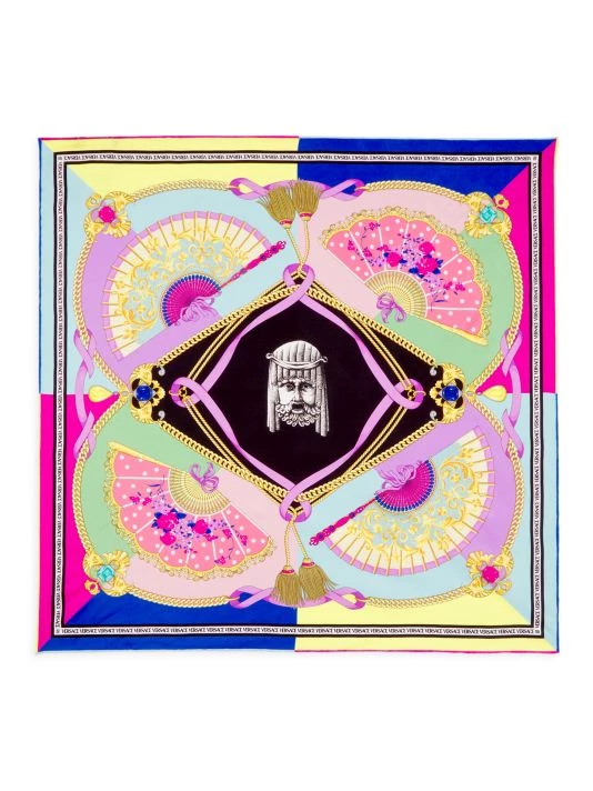 Made in Italy of fine silk, Versace’s square scarf is decorated in a signature Ventagli print.