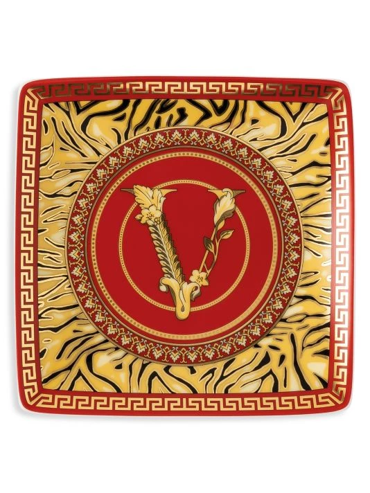 From the Virtus Collection. For over 135 years, Rosenthal has created contemporary, innovative designs for the tabletop, home interior, and that gift-giving occasion. Both known for excellence and elegance, the collaboration of Versace and Rosenthal combines German craftsmanship with Italian design to create truly luxurious pieces. Made from porcelain, this plate features Versace’s signature baroque motifs surrounding a large V at the focal point.