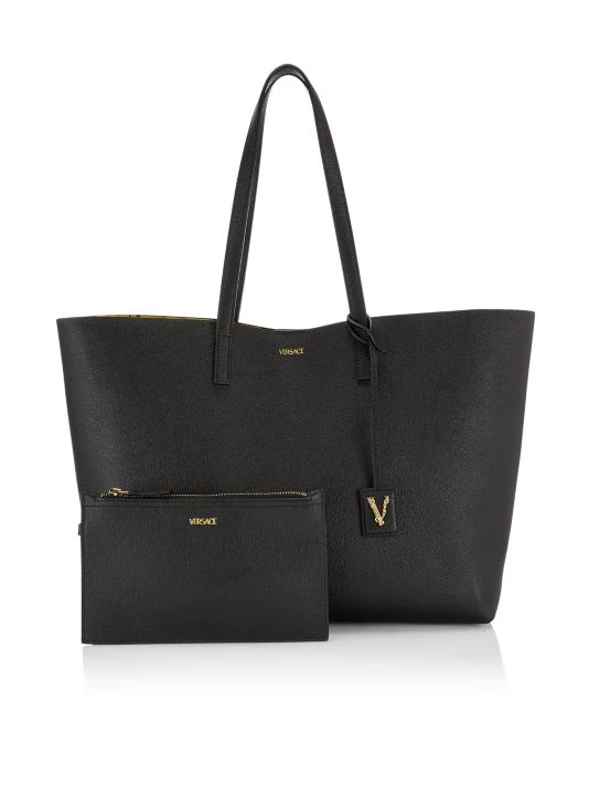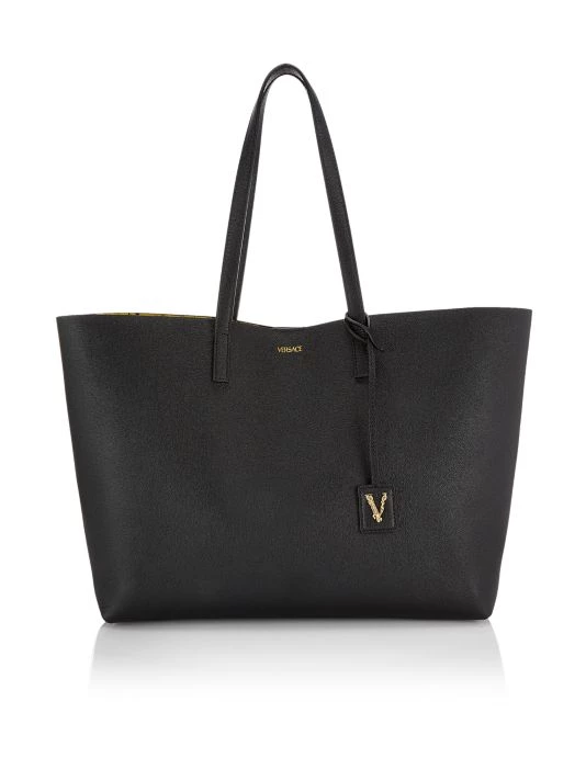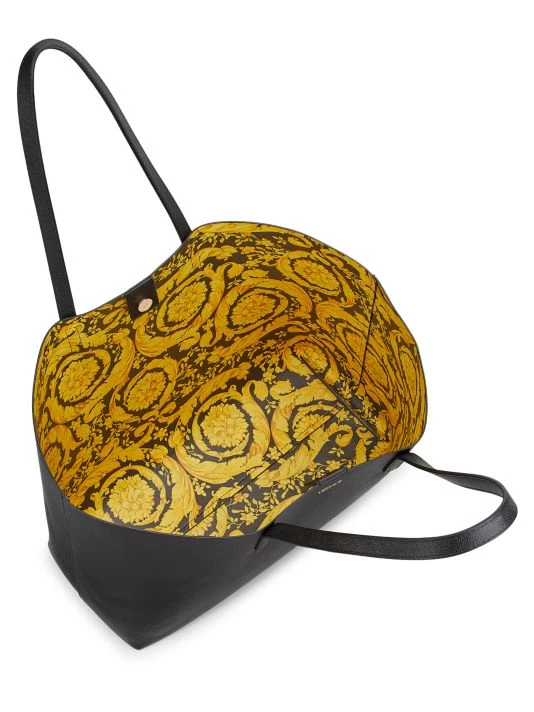 From the Virtus Collection. Made in Italy, Versace’s tote is crafted of premium leather with an instantly recognizable Barocco-print interior. The removable tag features a signature filigree V ornamentation.