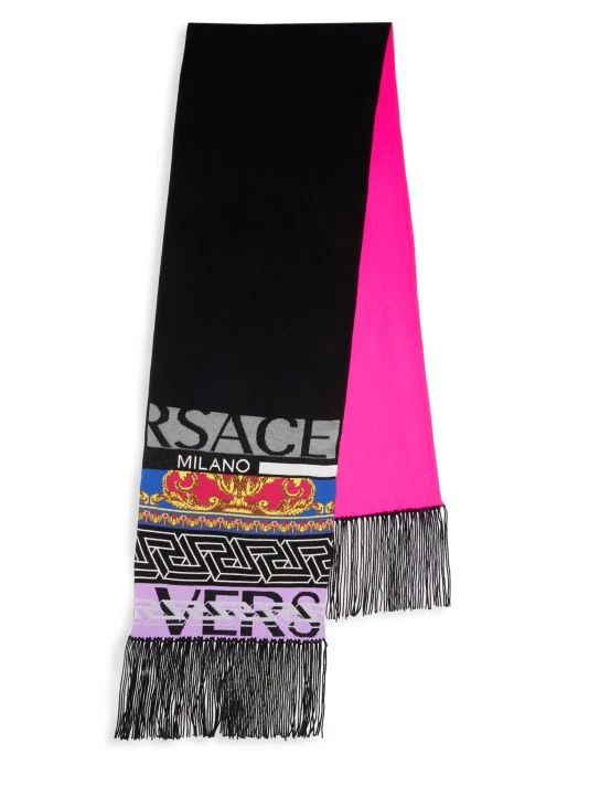This reversible wool knit scarf features various house codes jacquard and fringe trim.